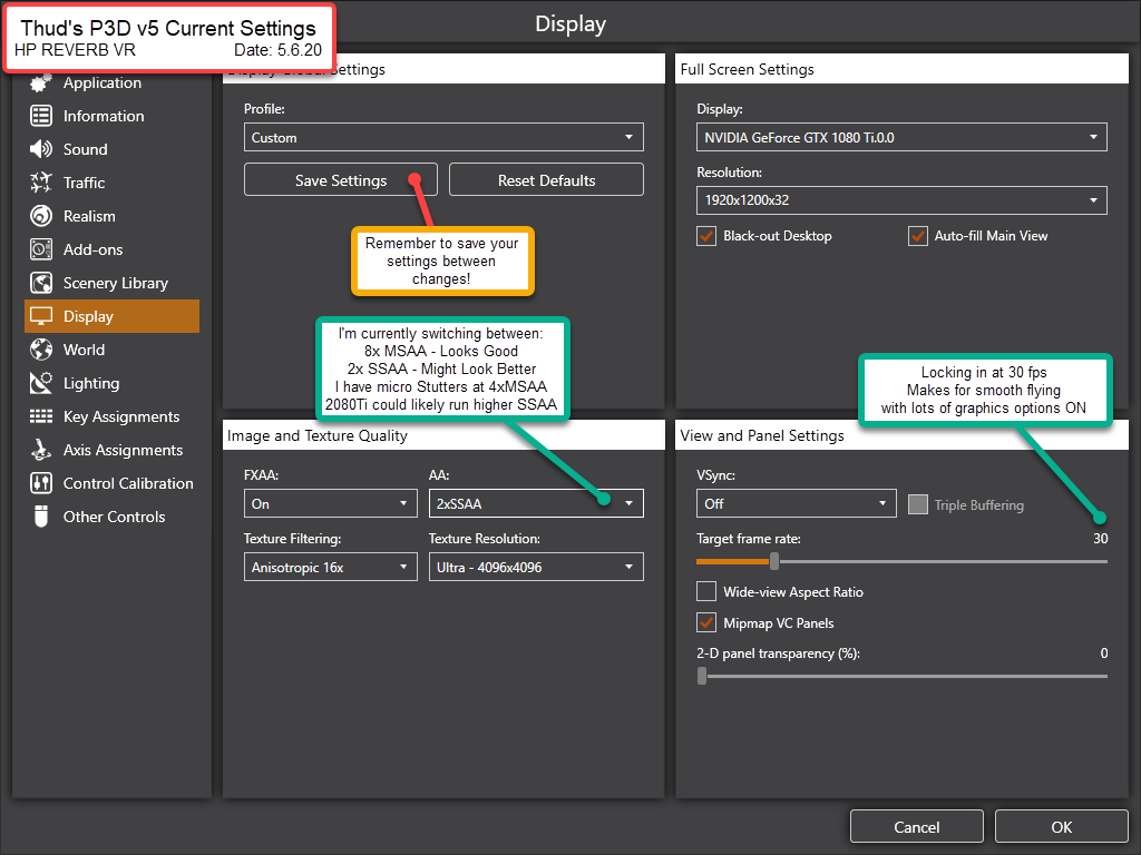 Below are my current settings as of the date on the graphics. I’m sharing for those upgrading and who may desire a starting point for tuning VR in P3D.